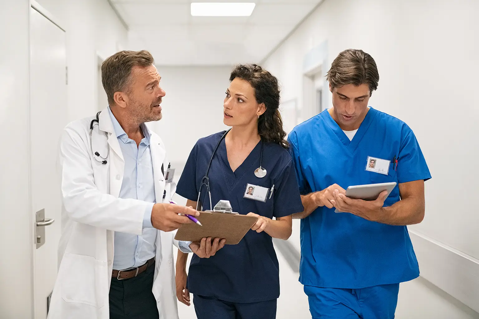 Three doctors walking together down a hospital hallway, engaged in conversation.